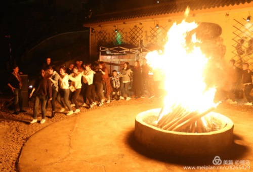 晚上在下榻的酒店附近又舉行篝火晚會,全員參與,圍著篝火,手拉手歡笑著跳躍著,瞧,肖總監跳躍多歡,笑容多么燦爛。大家在歡樂的樂曲聲中,跳著,忘卻一切白天環游的疲勞。