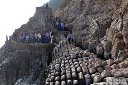 五百羅漢:因海水與巖崖不斷撞擊,歷盡無數歲月,海蝕成數十排獨立的崖石,仿佛是羅漢打座,面朝大海,呻吟著佛經,護佑蒼生,多么神奇的力量。董事長李德進笑坐羅漢群之上。